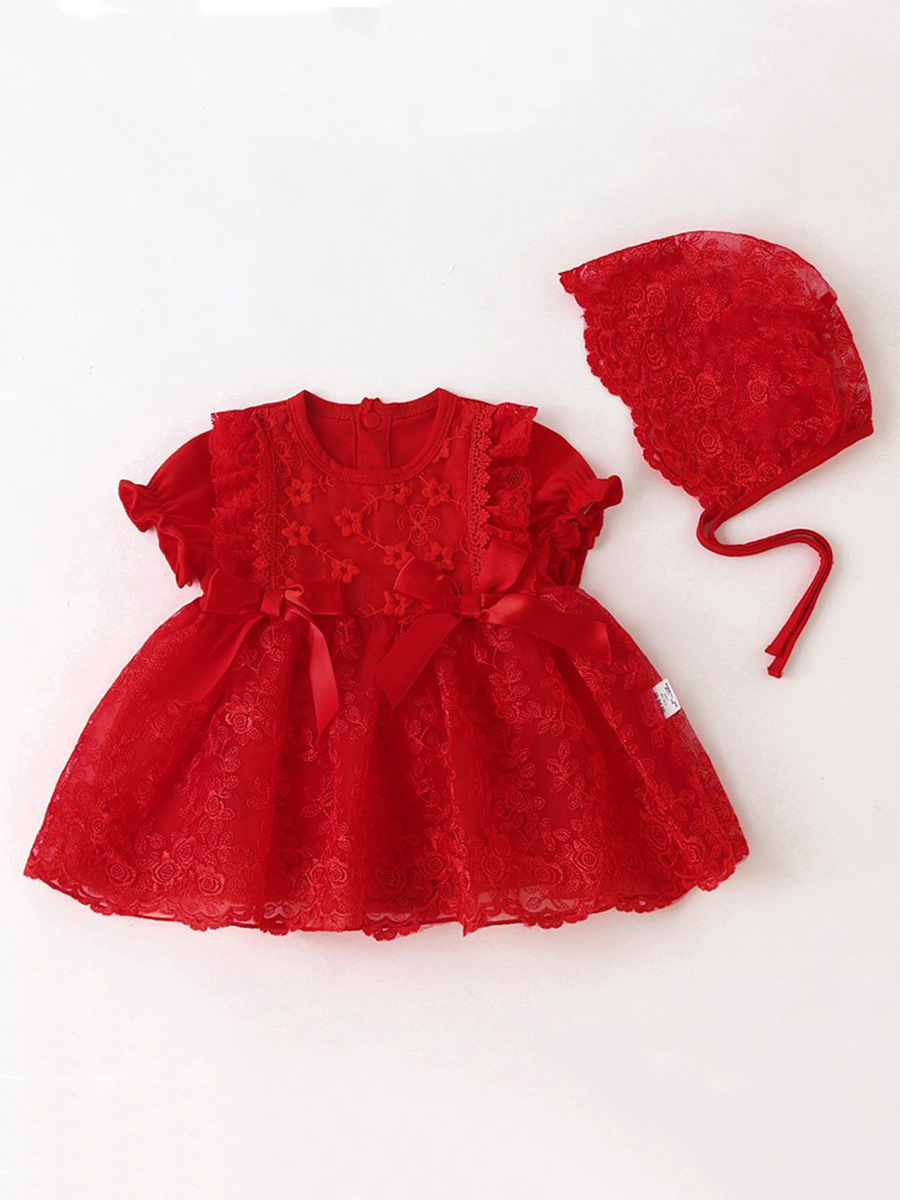 这款红色蕾丝连衣裙套装太惊艳!鲜艳正红,喜庆又夺目,节日氛围感拉满。裙身蕾丝精致,花纹细腻,短袖荷叶边俏皮灵动。双蝴蝶结设计,甜美优雅,网纱裙摆轻盈飘逸,宝宝穿上秒变童话小公主。