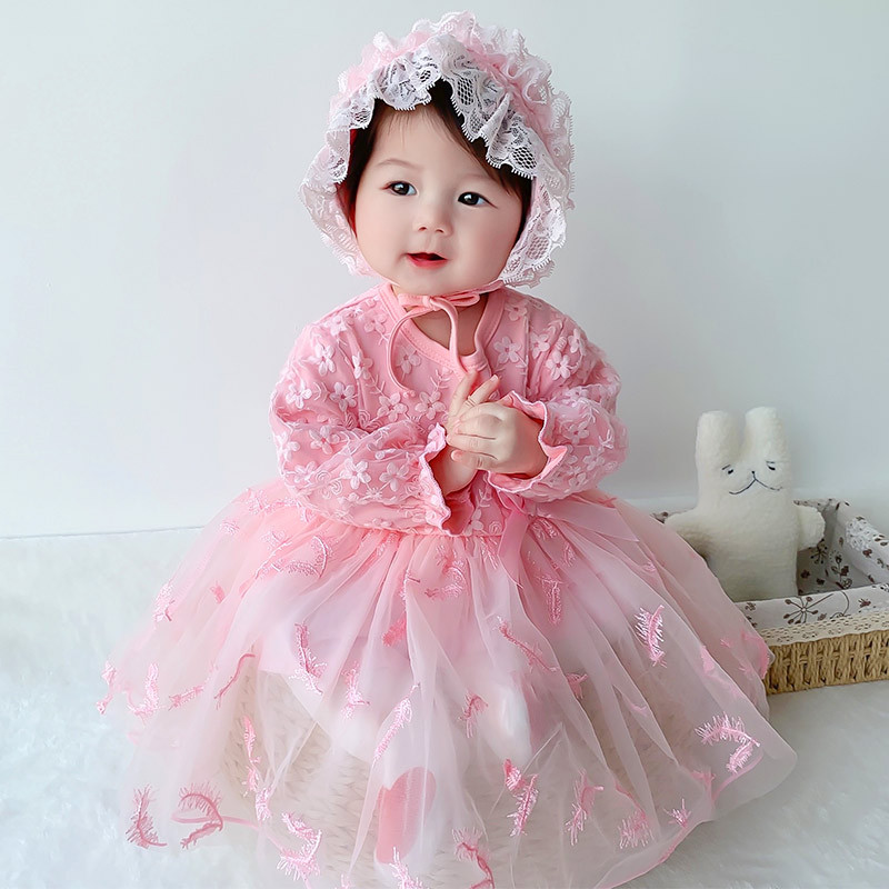 这是一款婴儿裙装,搭配同风格蕾丝帽,裙身有精致花纹,裙摆蓬松,尽显甜美可爱。长袖设计,适合宝宝穿着,有多种身高尺码可选,满足不同需求 。