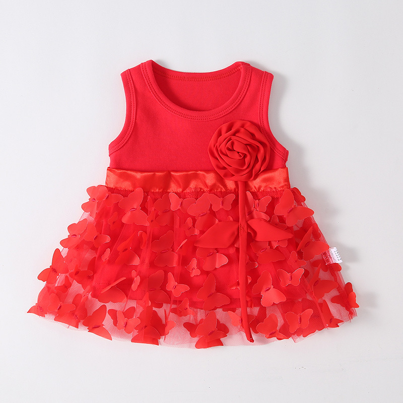 萌妈蓓这款红色公主裙套装超吸睛!正红色鲜艳夺目,喜庆又亮眼。无袖设计搭配大朵花朵装饰,时尚感满满。裙摆网纱层层叠叠,缀满蝴蝶造型,灵动飘逸,宝宝穿上就是童话里的小主角。 搭配同色系发饰和小鞋子,细节拉满。面料亲肤舒适,透气不闷热。