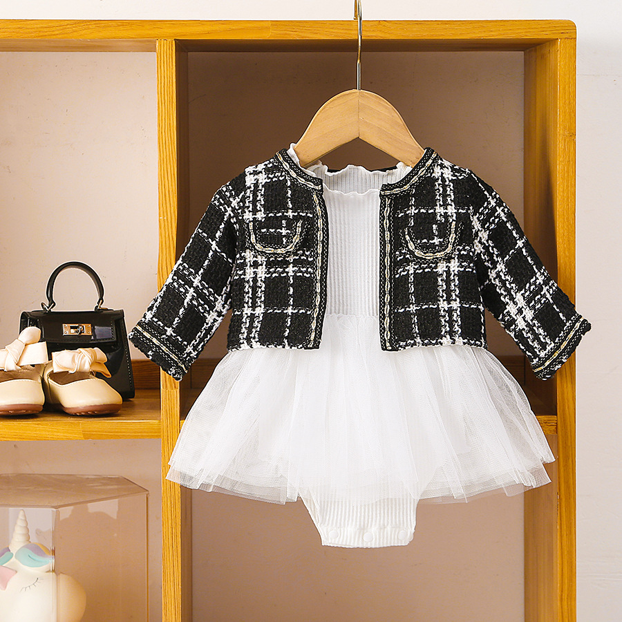 萌妈蓓这款小香风套装超吸睛!黑白格纹外套,精致编织边与口袋装饰,尽显优雅格调,七分袖设计时尚又实用。内搭白色连体衣,网纱裙摆轻盈飘逸,梦幻感拉满。 A 类品质保障,面料柔软亲肤。无论是日常出街还是参加聚会,宝宝穿上秒变时尚小达人。