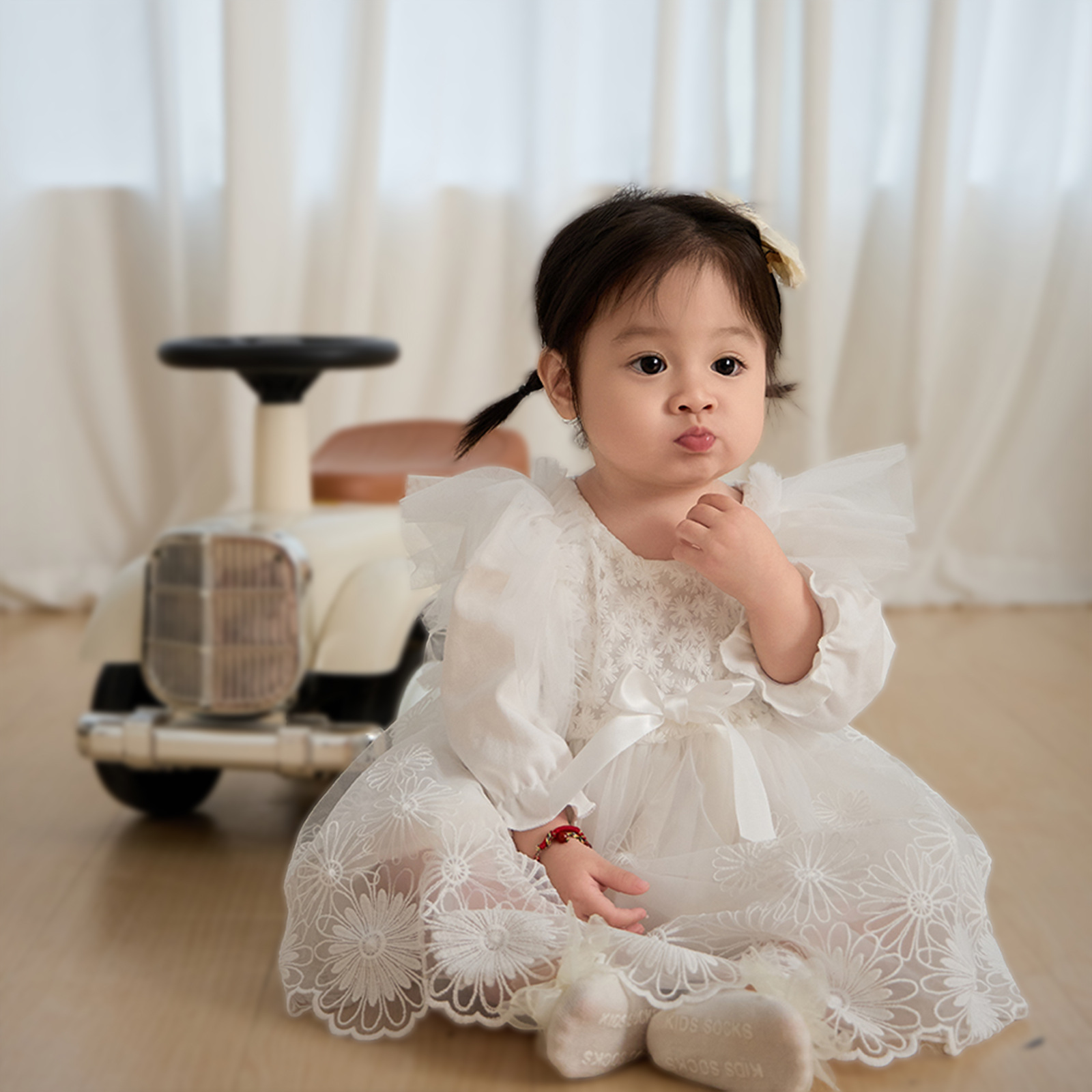 这件白色童装连衣裙,以纯洁色调开启童话序章。欧根纱长袖轻盈若云,立体花朵刺绣铺满裙身,像把春日繁花织进面料。腰间蝴蝶结丝带,轻轻一系便勾勒可爱轮廓,裙摆蕾丝花边随动作漾起温柔弧度。从柔软内衬到精致车线,层层质检打磨细节,亲肤不刺激,让宝宝穿上云朵般的柔软,既是日常萌趣穿搭,又能变身小聚会里的“小花童”,把童真与美好,都藏进这身甜甜的设计里 。