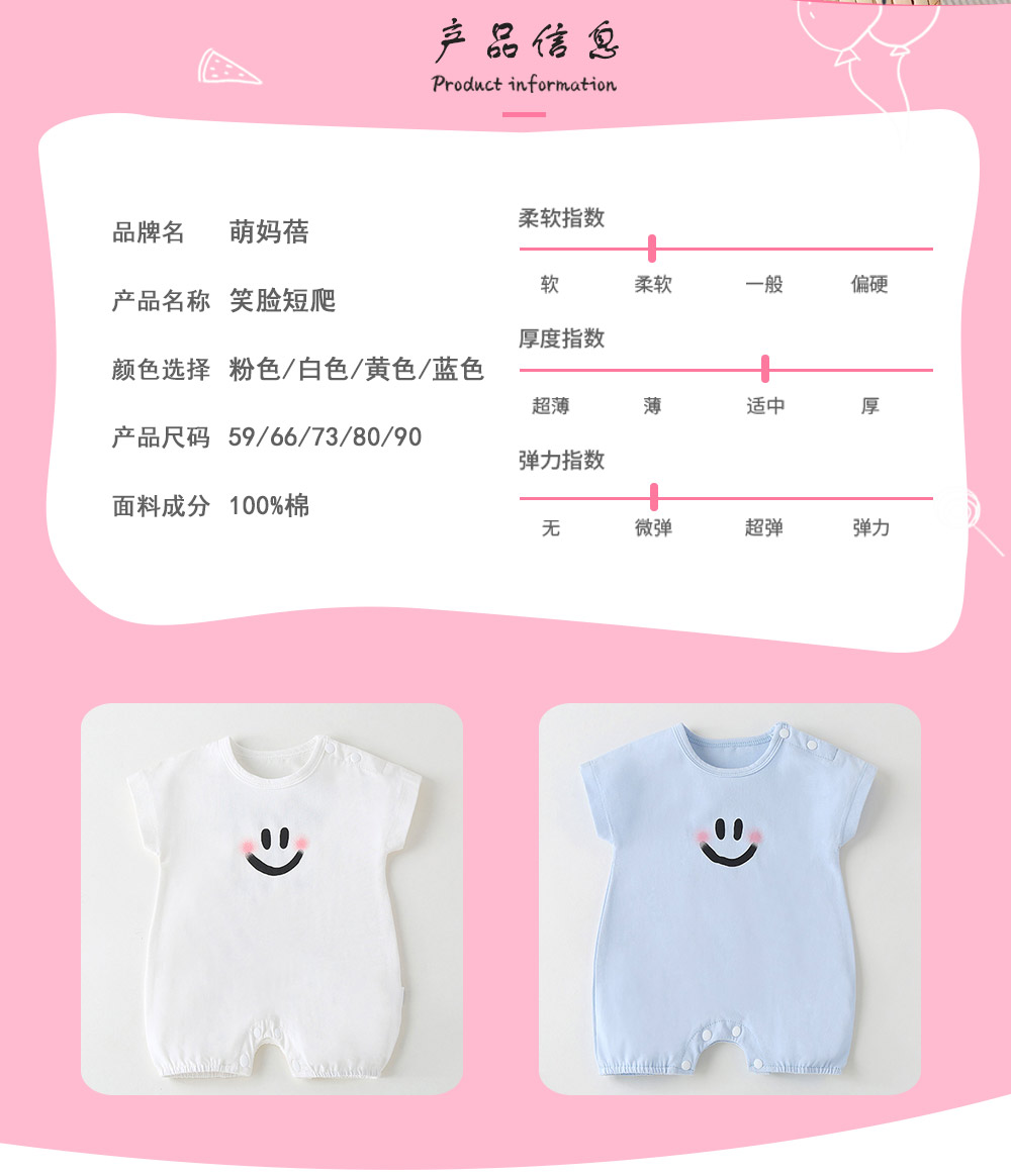 品牌:萌妈蓓 风格:韩版 面料名称:棉 安全等级:A类 主面料成分:棉 款式:短爬 适用性别:中性 适合季节:夏季 图片实拍:实拍有模特 适合身高:59CM,66CM,73cm,80CM,90CM