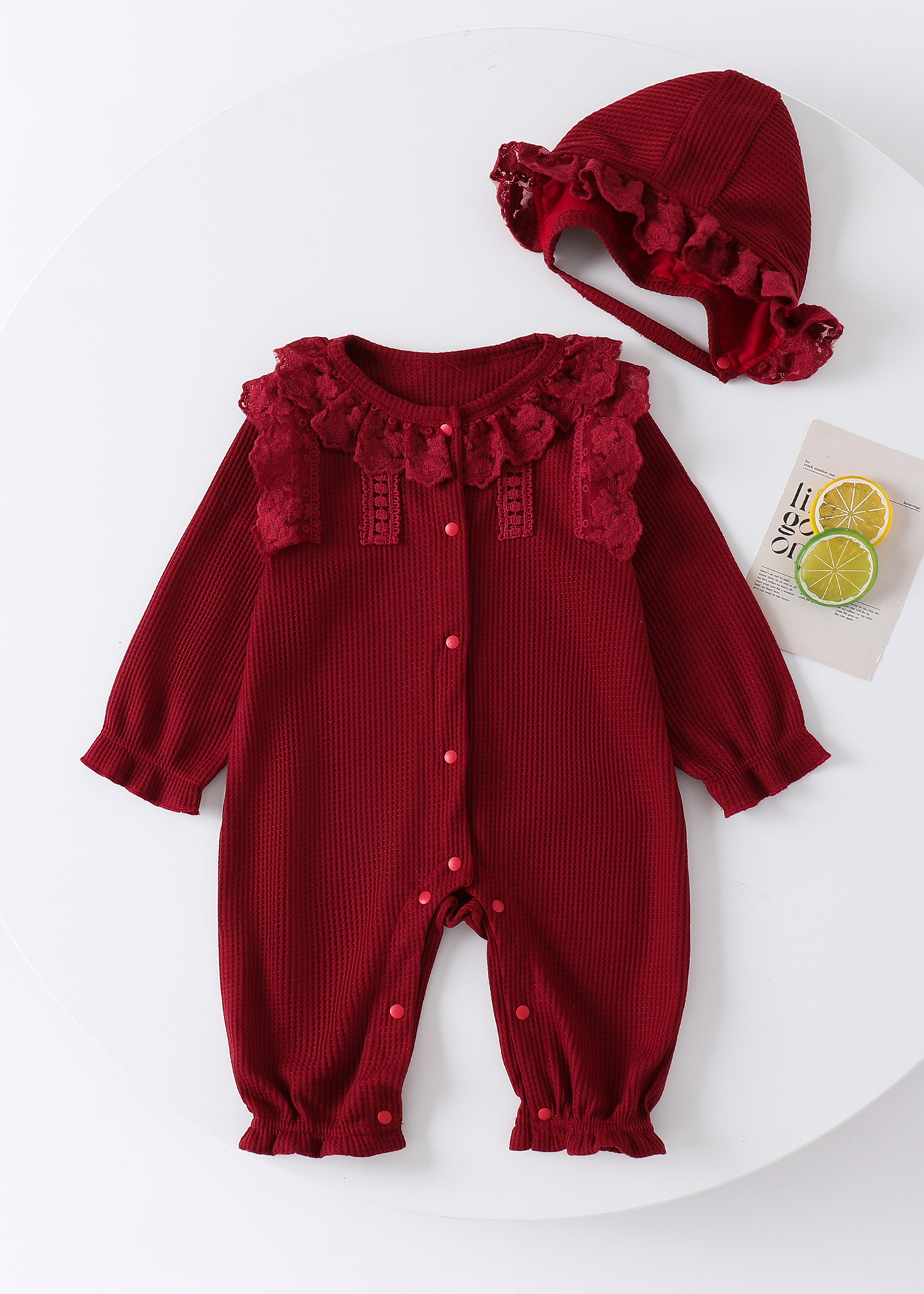 喜庆红婴儿连体衣,蕾丝花边+萌趣小帽,柔软亲肤,满月、周岁穿超有仪式感 。联系13727350887有线下拿货扶持