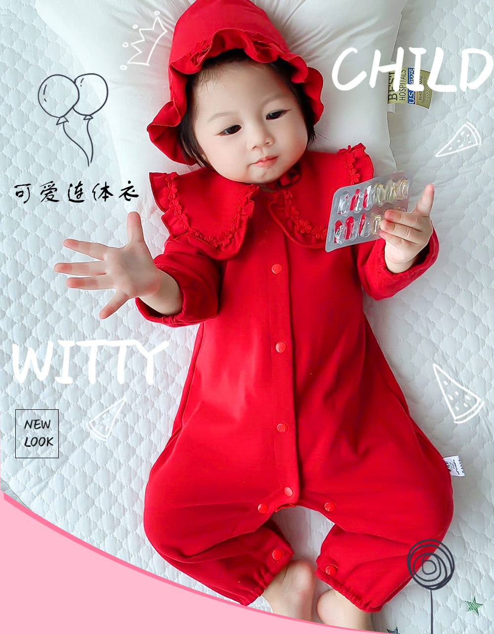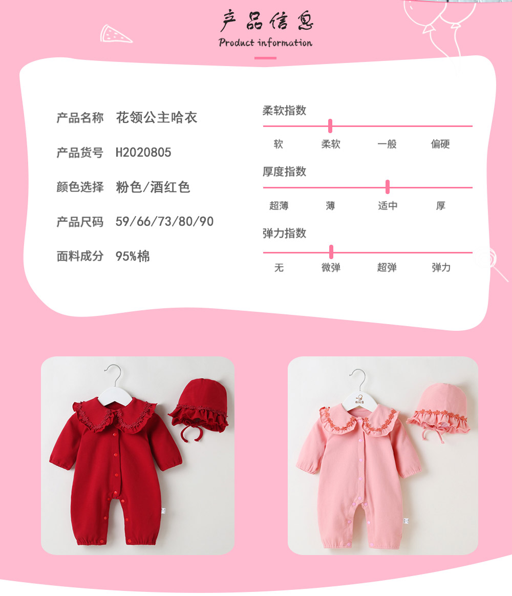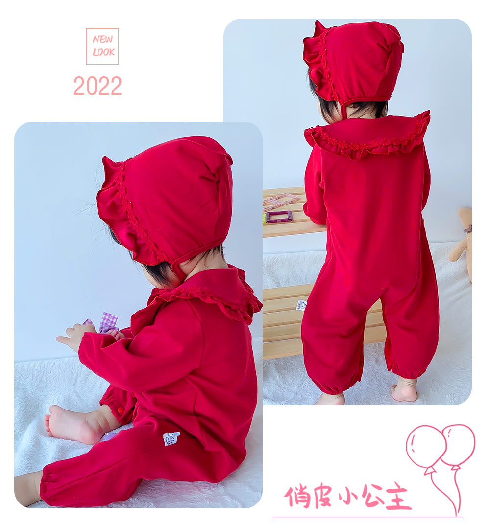 宝妈们无法抗拒的宝宝穿搭来啦!这款红色连体衣,喜庆又亮眼。大翻领搭配精致花边,复古韵味十足,按扣设计方便穿脱。联系13727350887有线下拿货扶持