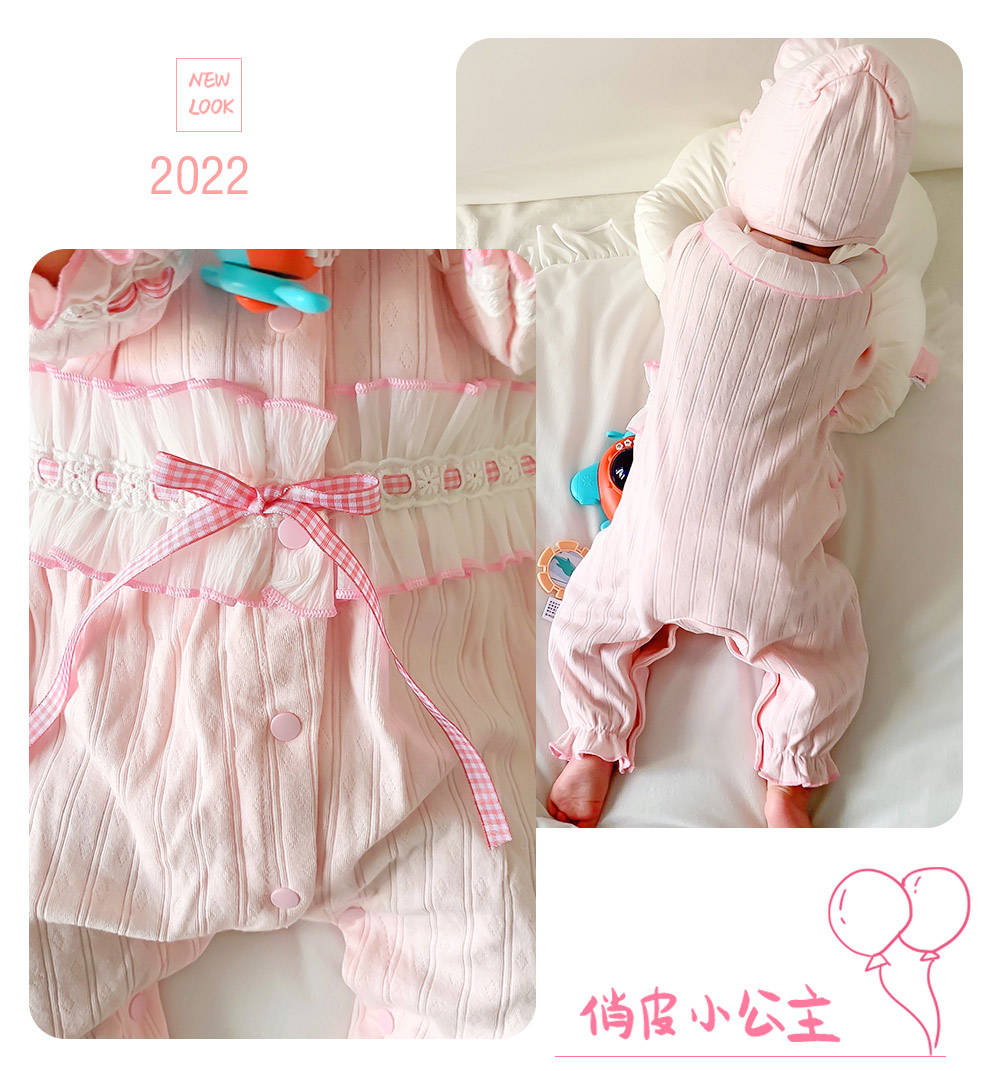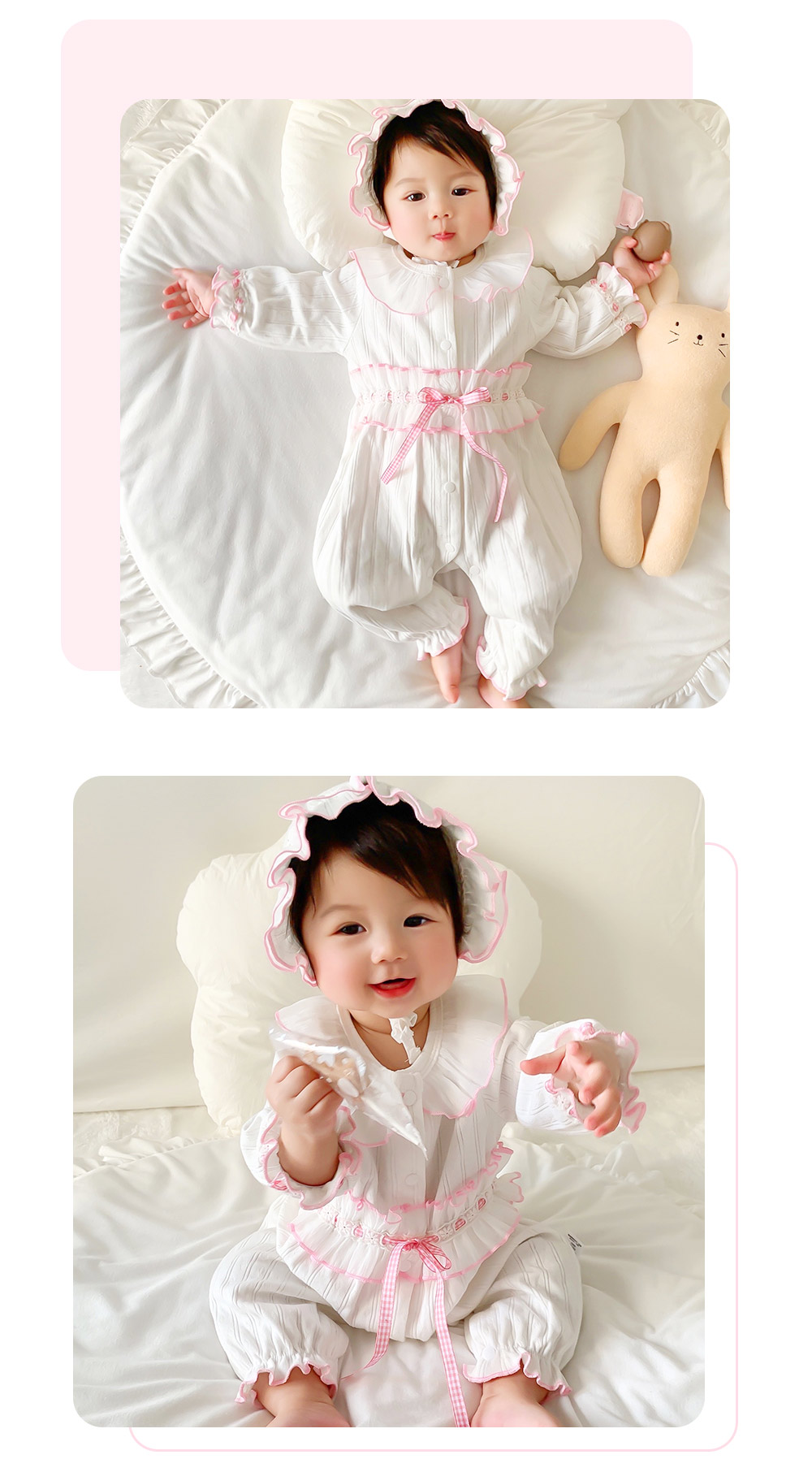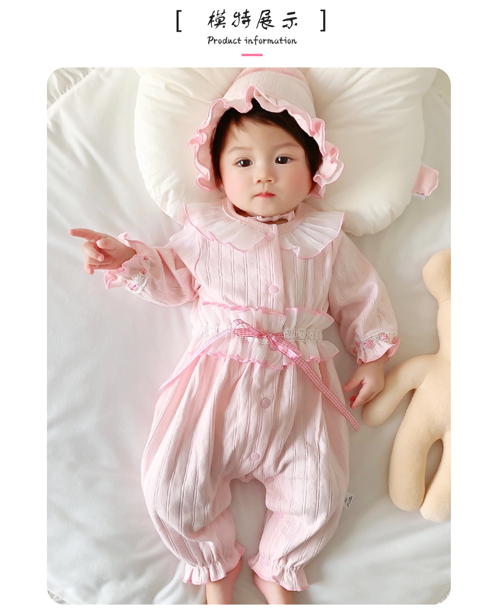 这款粉色连体衣套装萌翻啦!浅粉色系温柔甜美,竖条纹设计简约又时尚。娃娃领搭配荷叶边,精致可爱,袖口蕾丝细节满满。腰间格纹蝴蝶结俏皮灵动,增添甜美感。