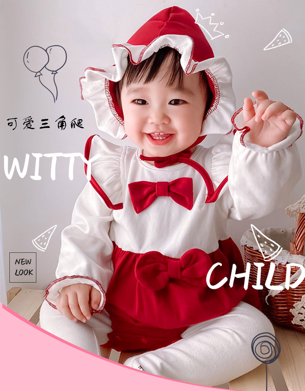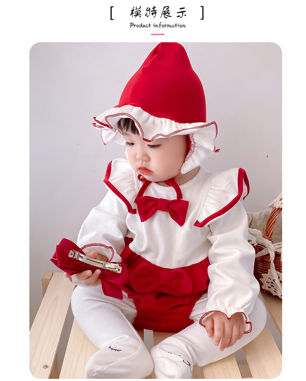 这款小红帽风格连体衣太萌啦!经典红白配色,吸睛又可爱。白色长袖部分,袖口和领口红色缝线装饰,精致感拉满。红色大蝴蝶结俏皮灵动,搭配同色系裙摆,复古韵味十足。