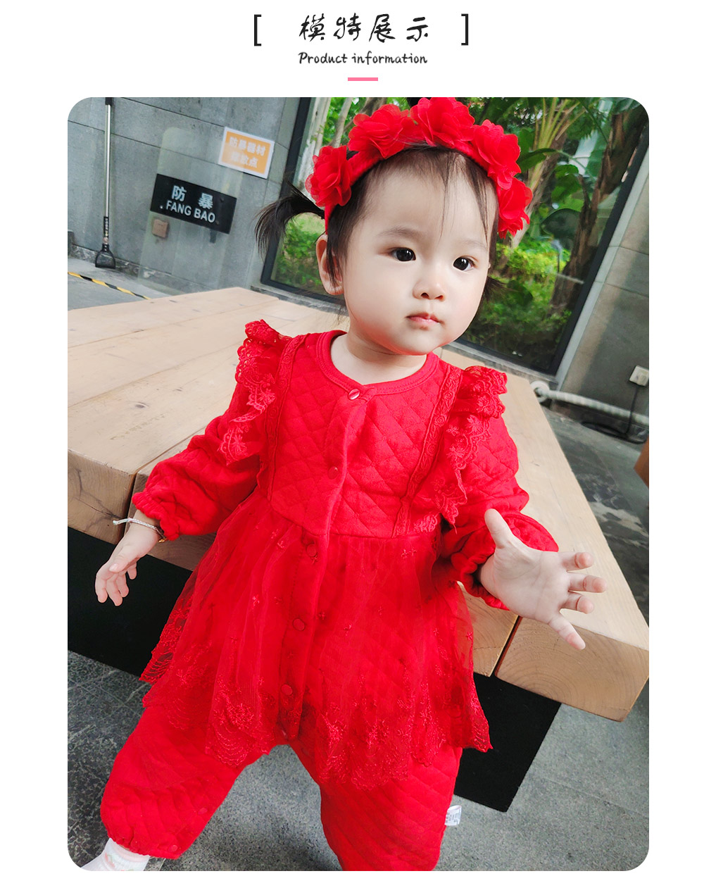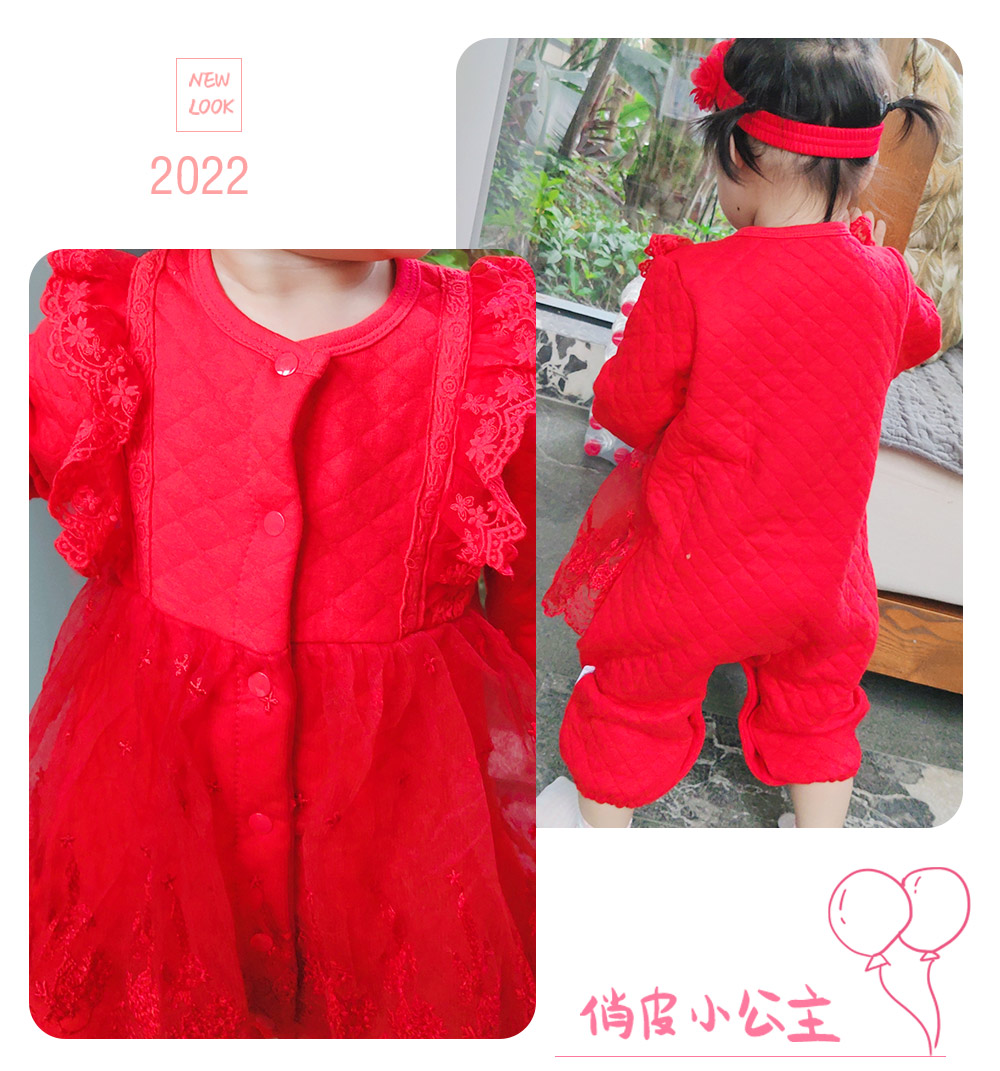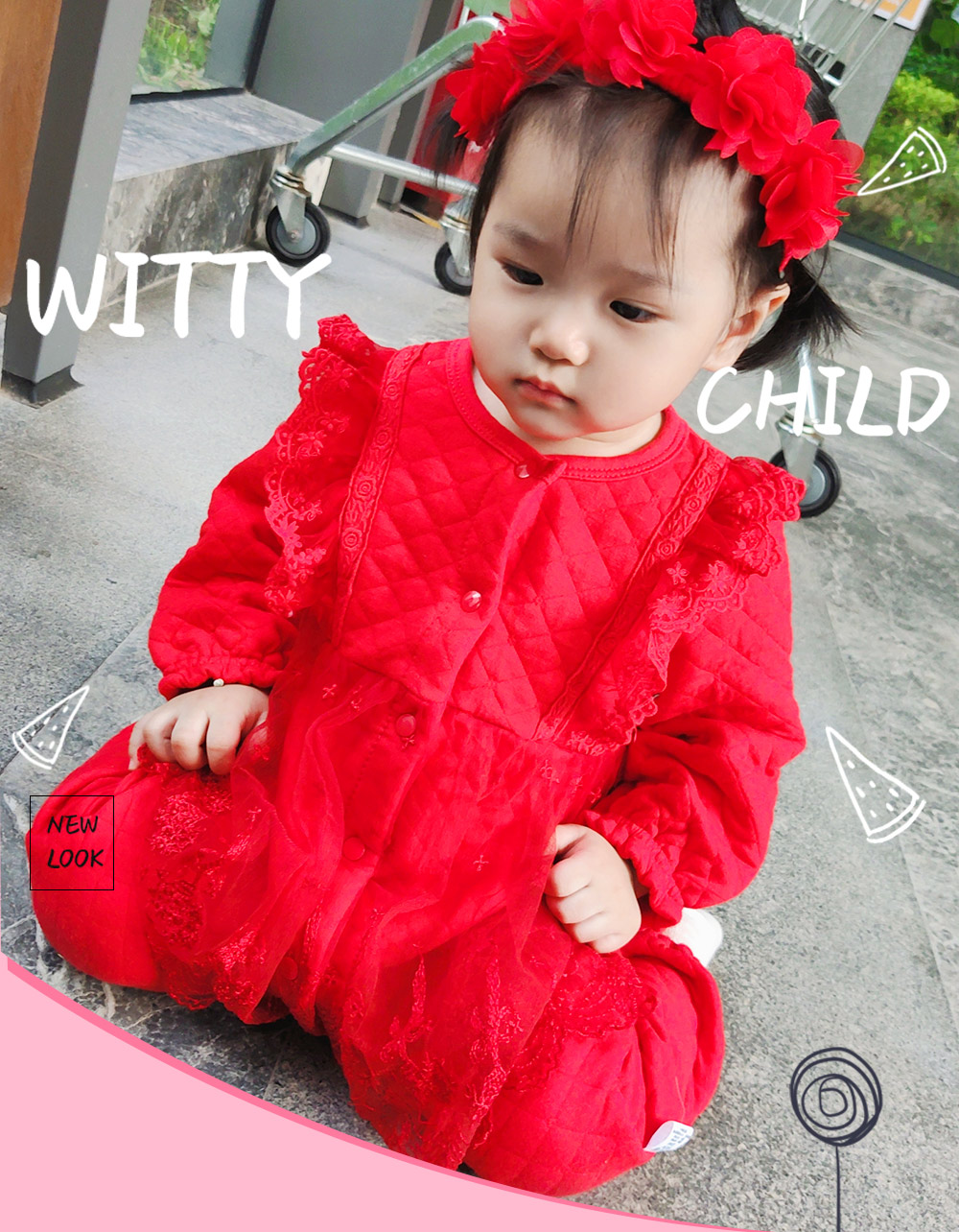 这款红色连体衣萌趣又保暖!超衬宝宝肤色。菱形格纹设计,满满质感。蕾丝花边与红色褶皱装饰肩边,精致甜美,网纱裙摆绣着精美花纹,仙气飘飘。