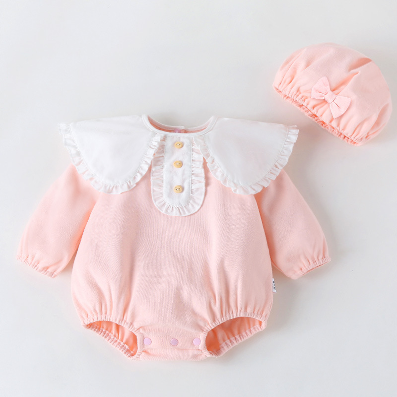 这是一套婴儿服饰,包含连体衣与帽子。连体衣有大翻领、纽扣设计,款式可爱,从评价看面料舒适、质量不错,很适合宝宝穿搭 。