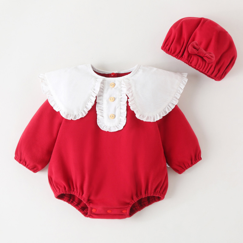 这是一套婴儿服饰,包含连体衣与帽子。连体衣有大翻领、纽扣设计,款式可爱,从评价看面料舒适、质量不错,很适合宝宝穿搭 。