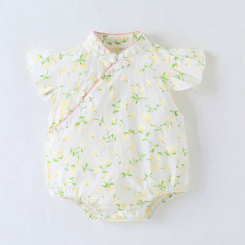 这款国风连体衣太有韵味啦。白色底色搭配清新的黄绿小花图案,满满春日氛围感。立领配蕾丝花边,精致又典雅,盘扣设计增添传统韵味,飞袖俏皮可爱。 咱的品质超靠谱,A 类标准,柔软亲肤,呵护宝宝娇嫩肌肤。无论是日常穿搭还是参加传统活动,宝宝都能穿出独特风格。 批发商、童装店主们,这样别具一格的童装,能为店铺吸引更多顾客,别错过商机,赶紧下单囤货,开启热卖新潮流!