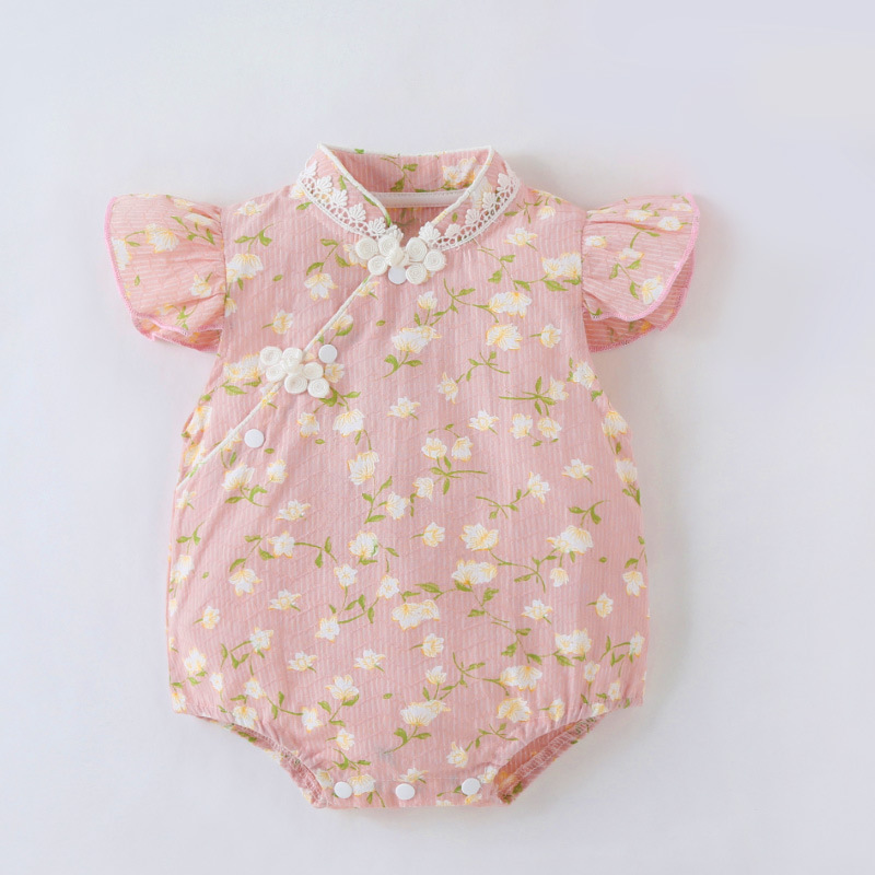 这款国风连体衣太有韵味啦。白色底色搭配清新的黄绿小花图案,满满春日氛围感。立领配蕾丝花边,精致又典雅,盘扣设计增添传统韵味,飞袖俏皮可爱。 咱的品质超靠谱,A 类标准,柔软亲肤,呵护宝宝娇嫩肌肤。无论是日常穿搭还是参加传统活动,宝宝都能穿出独特风格。 批发商、童装店主们,这样别具一格的童装,能为店铺吸引更多顾客,别错过商机,赶紧下单囤货,开启热卖新潮流!