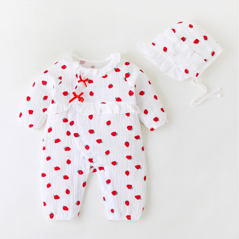 这是婴儿连体衣套装,含帽子。衣服布满圆点图案,有褶皱设计,胸前配交叉装饰,风格可爱俏皮,适合宝宝日常穿着,尽显童真童趣 。
