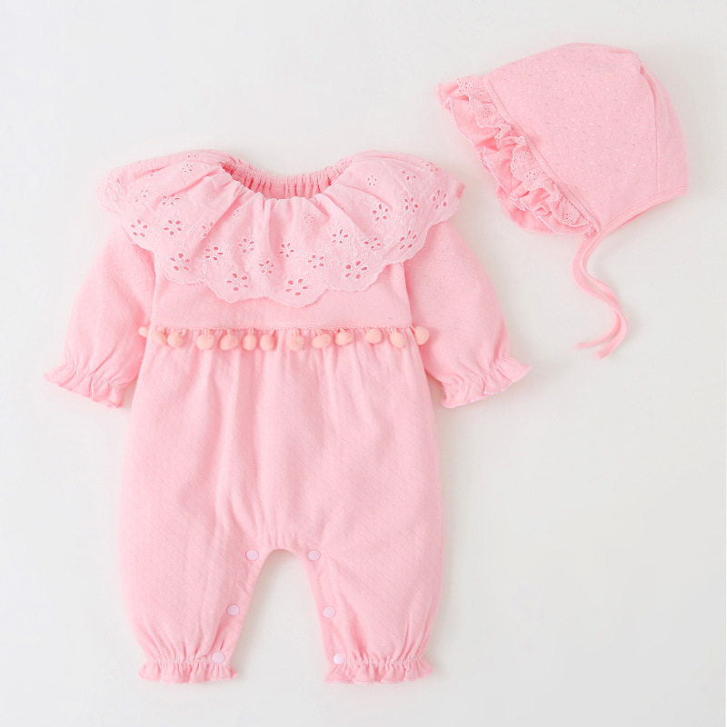 这款婴儿连体衣套装,整体为柔和粉色,甜美又治愈。衣服领口有精致荷叶边与镂空花纹,增添可爱精致感,搭配同色系小帽子,软萌度拉满,面料舒适亲肤,妥妥的“萌娃出街”必备!