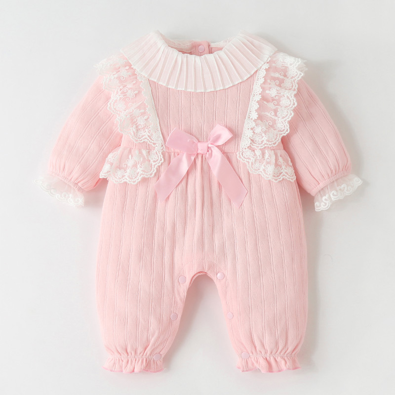 这款粉色连体衣简直甜到心坎里。温柔粉色,搭配白色蕾丝花边,精致感拉满。大翻领设计俏皮可爱,泡泡袖灵动有趣,腰间蝴蝶结甜美加分。按扣方便穿脱,细节超贴心。 咱是实力厂家,严格把控品质,面料亲肤柔软,给宝宝最舒适的穿着感受。无论是日常玩耍还是拍照留念,宝宝穿上都萌态十足。 批发商、童装店主们,这样的爆款童装,能轻松吸引顾客,别错过商机,赶紧囤货,开启热卖模式!