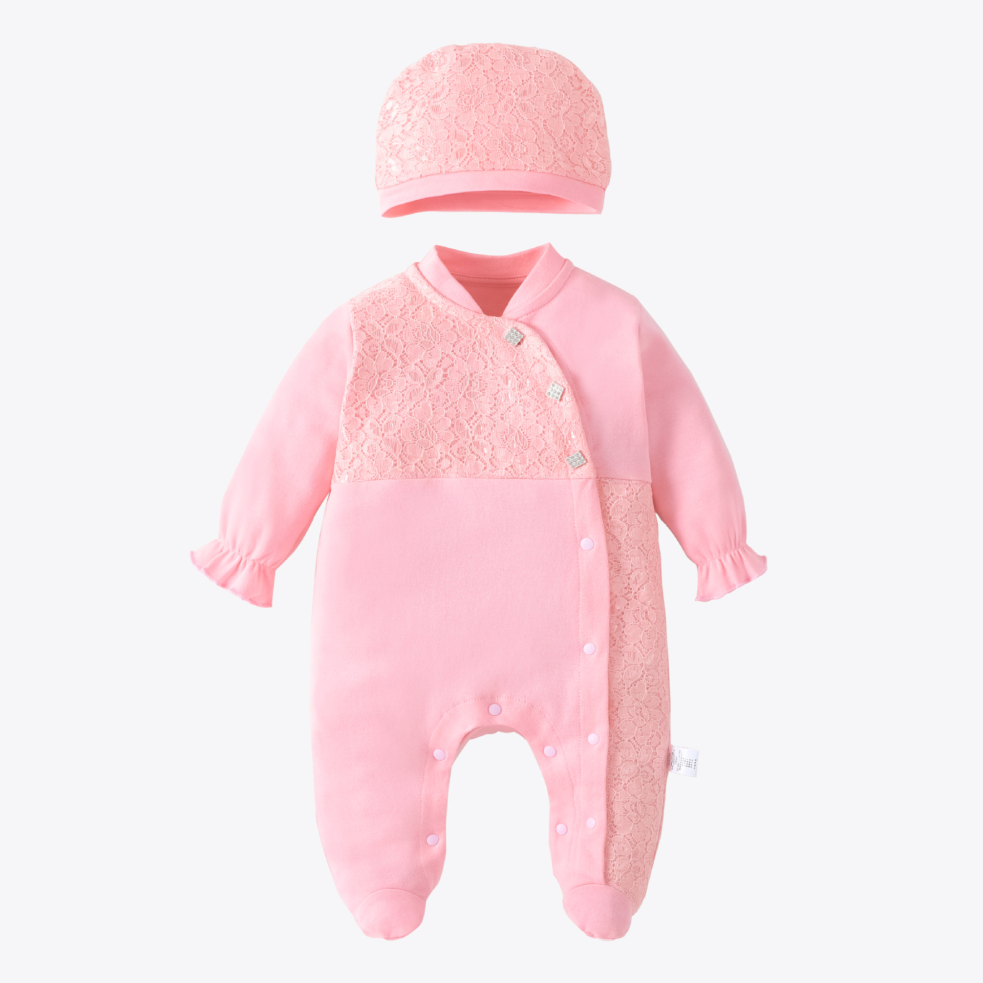 这是一套婴儿连体衣套装,含配套帽子。连体衣采用柔软亲肤面料,贴合宝宝娇嫩肌肤。衣身部分拼接精致花纹面料,增添设计感。斜襟排扣设计,方便穿脱与换尿布,袖口做了可爱的褶皱处理,细节用心。整体款式简约又不失精致,既保证了实用性,能给予宝宝舒适包裹,又具备美观度,是给新生儿增添可爱穿搭、呵护宝宝日常的不错选择 。